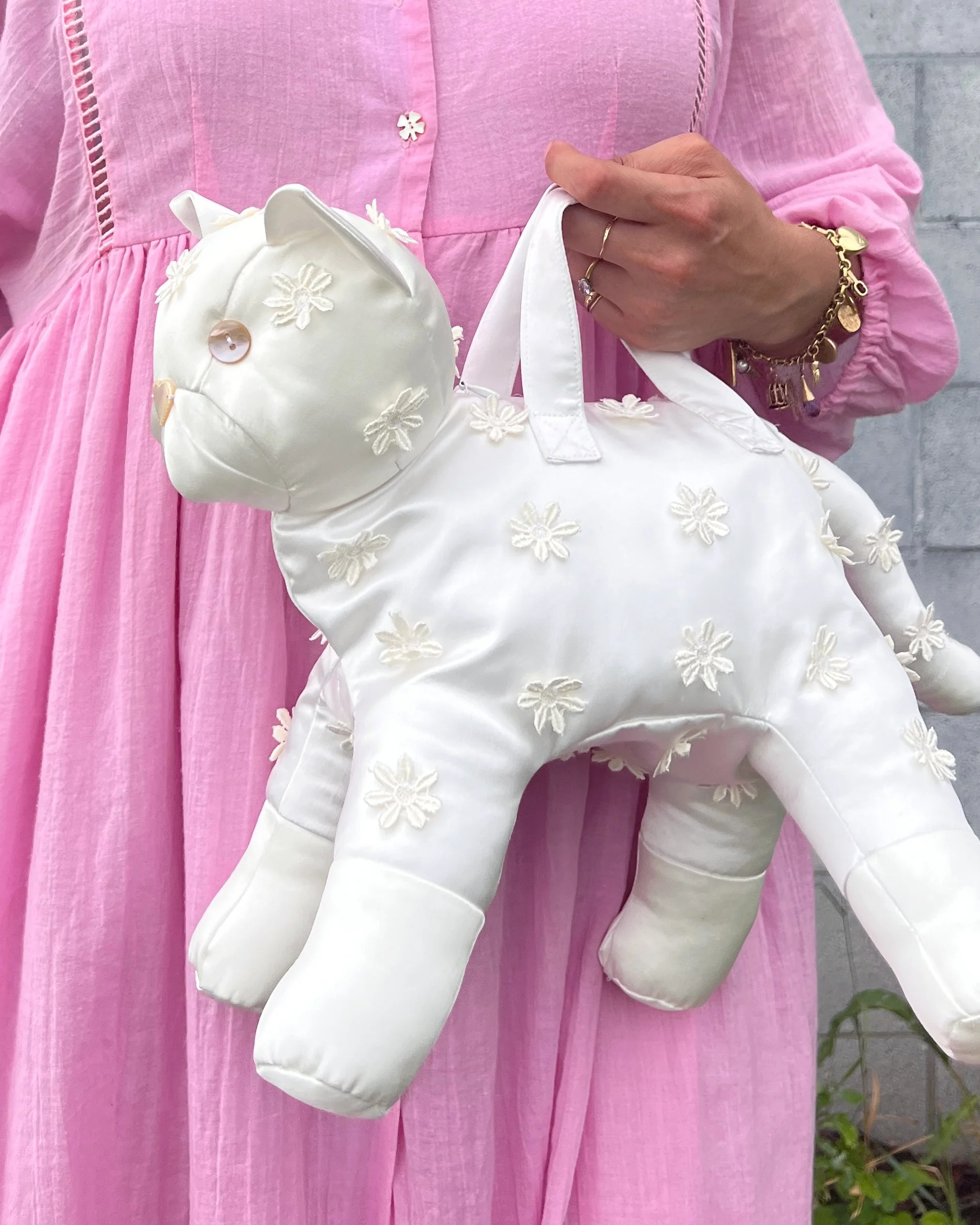 Stuffed cat shaped purse, sewn out of silk charmeuse.