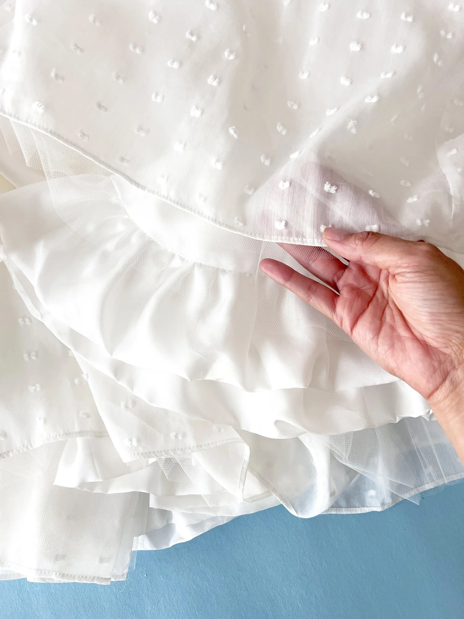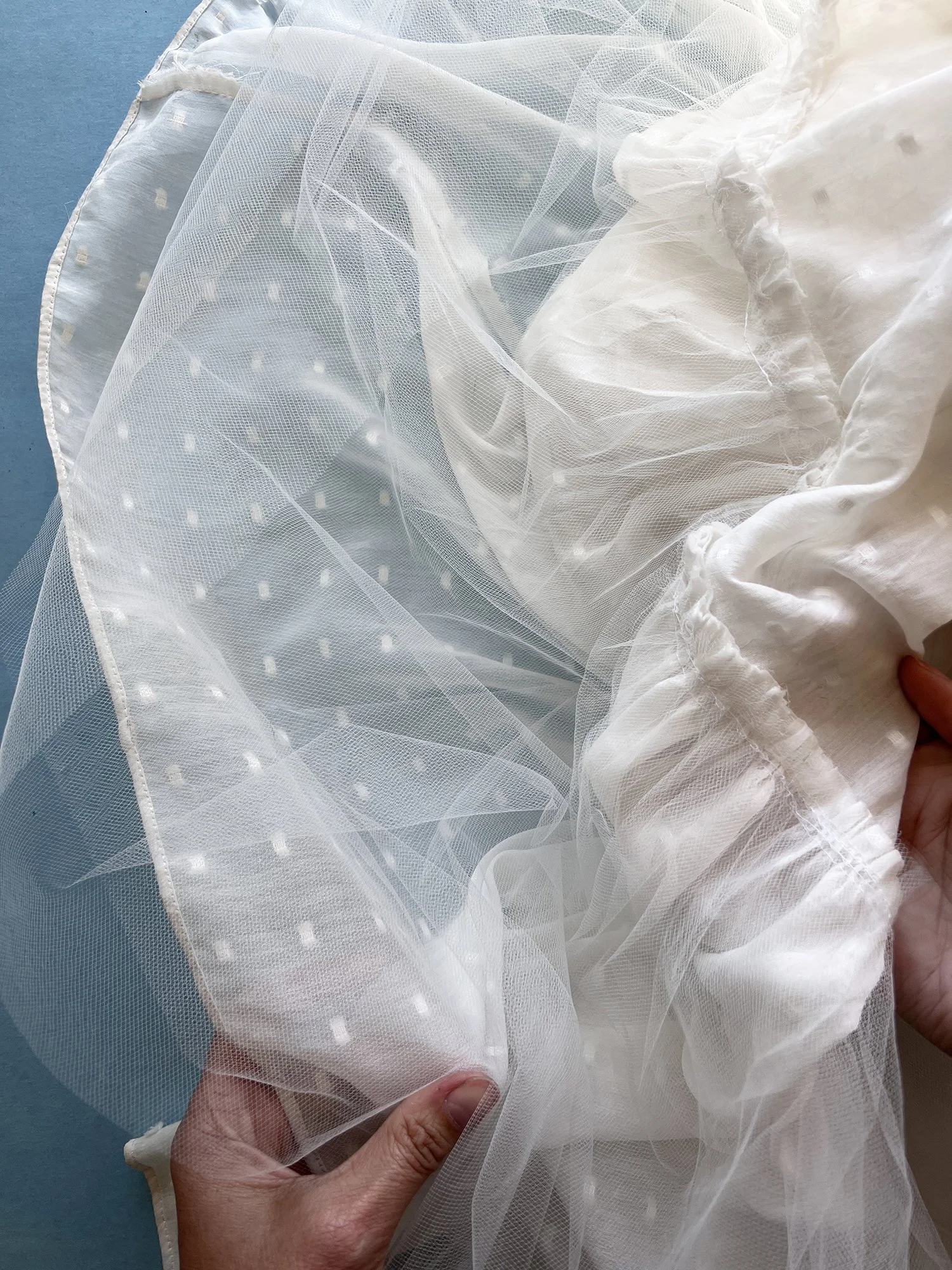Two layers of soft tulle are gathered with the Swiss dot fabric.